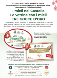Un’iniziativa per valorizzare il patrimonio di qualità, varietà e tipicità dei mieli italiani, cercando anche di dare un piccolo aiuto alle attività del territorio, portando un po’ di colore e dolcezza in questo periodo! Ci vediamo a Castel San Pietro Terme per le festività natalizie 2021!